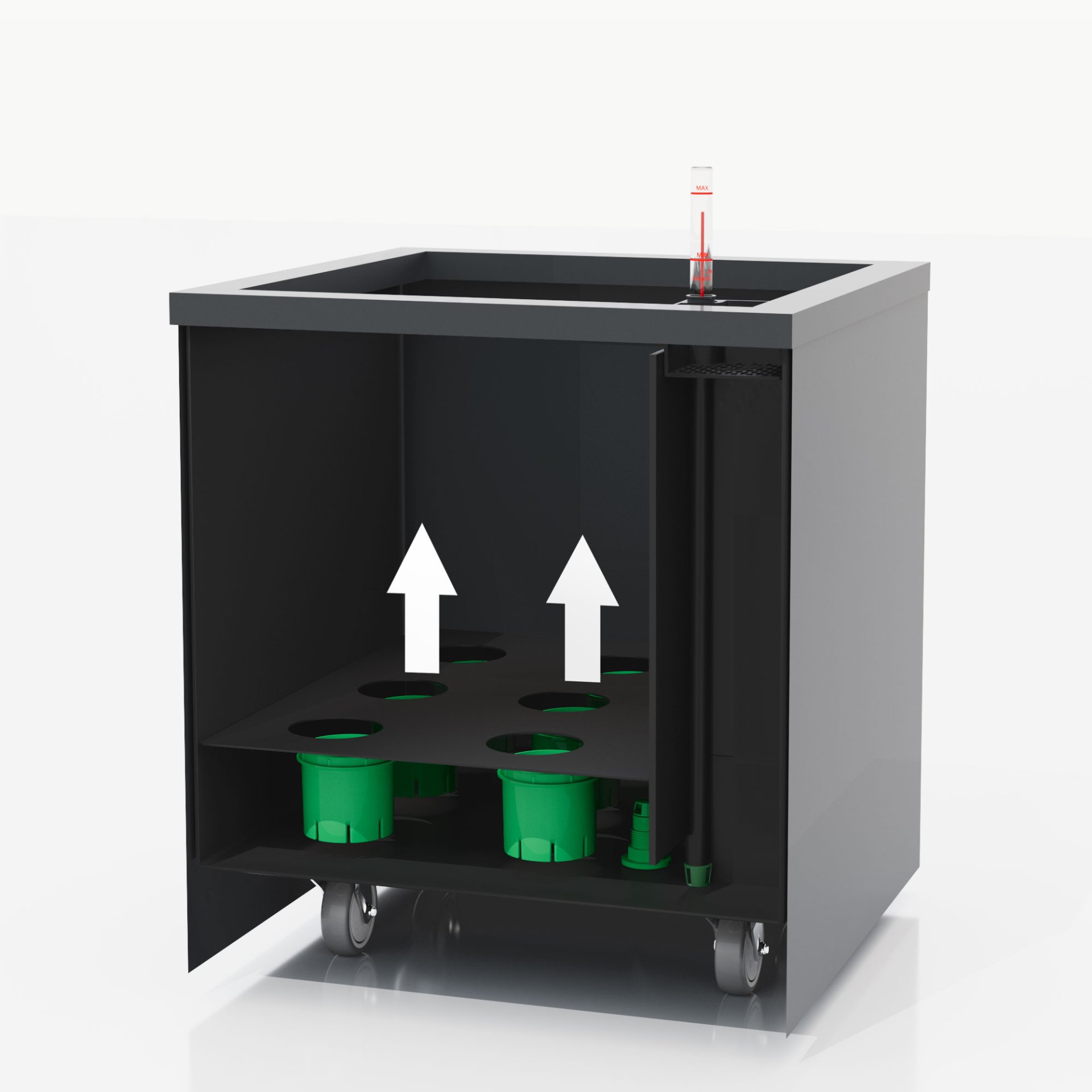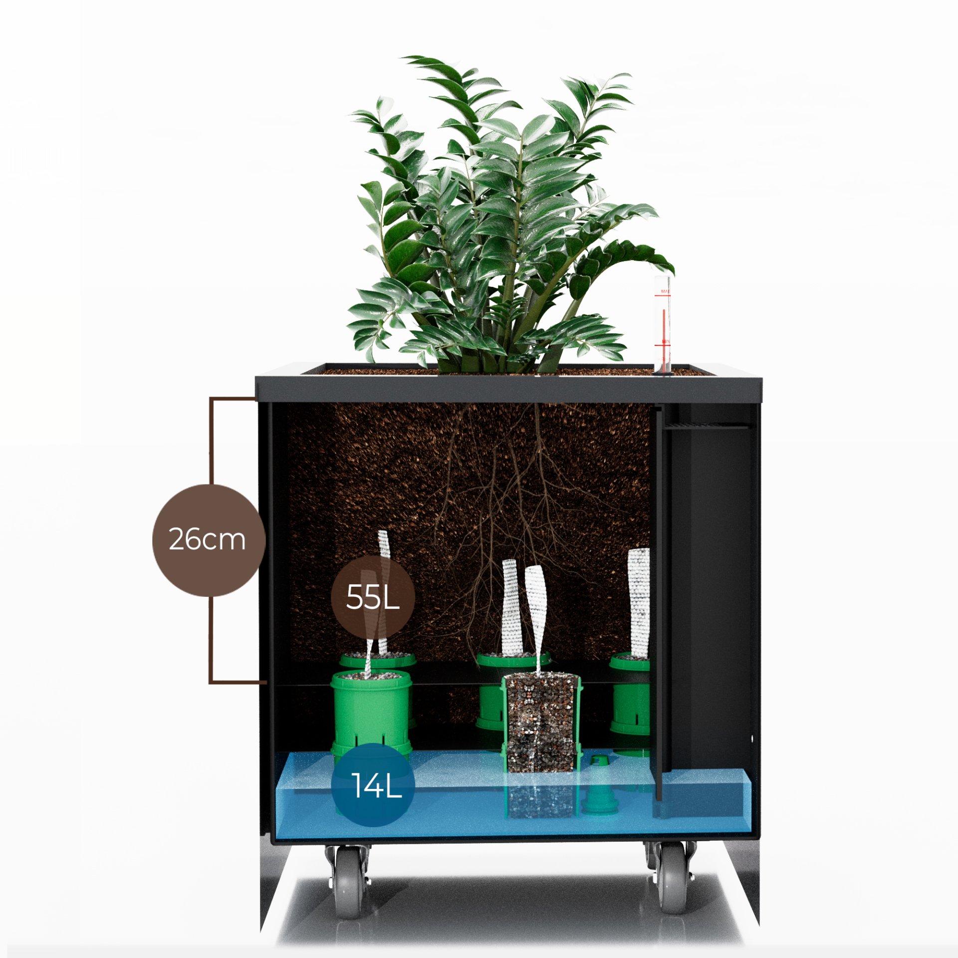 Květináč spojuje dvě základní funkce pro zdravý růst rostlin – velký objem a samozavlažovací funkci. Objem pro substrát lze upravit dle velikosti rostliny – dvě úrovně dna. Samozavlažovací funkce každého květináče je doplněna o důmyslný odtok přebytečné vody v exteriéru.