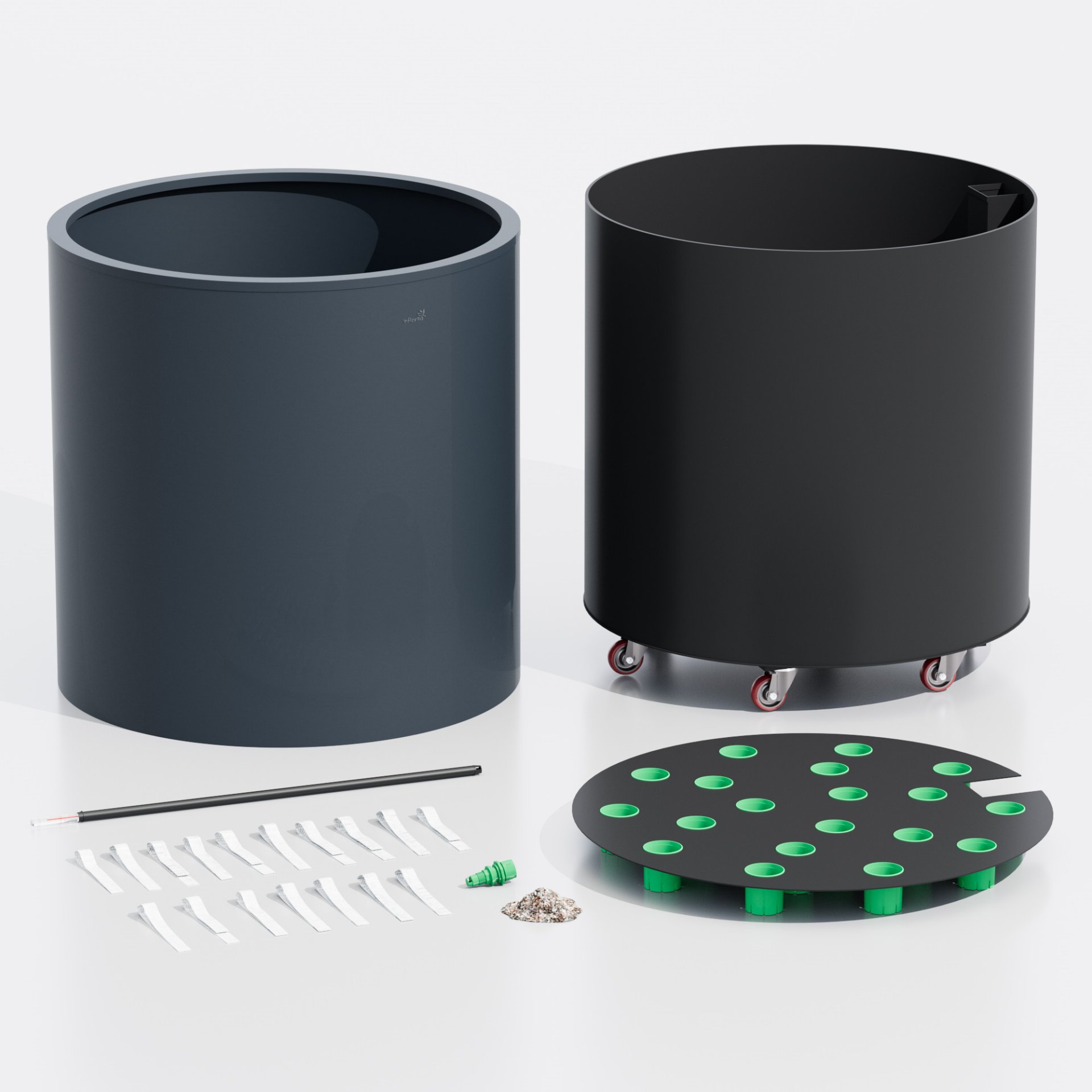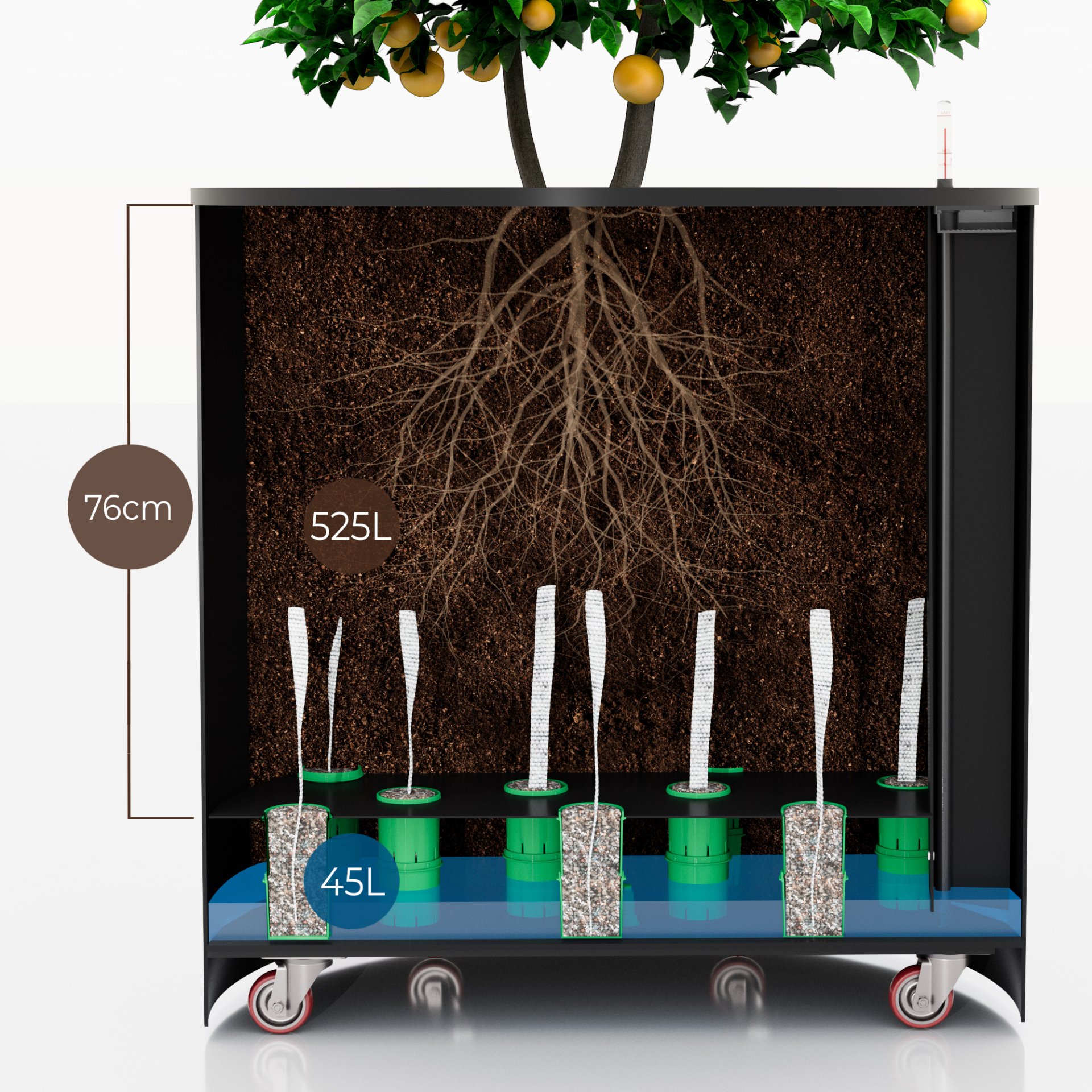 Květináč spojuje dvě základní funkce pro zdravý růst rostlin – velký objem a samozavlažovací funkci. Objem pro substrát lze upravit dle velikosti rostliny – dvě úrovně dna. Samozavlažovací funkce každého květináče je doplněna o důmyslný odtok přebytečné vody v exteriéru.
