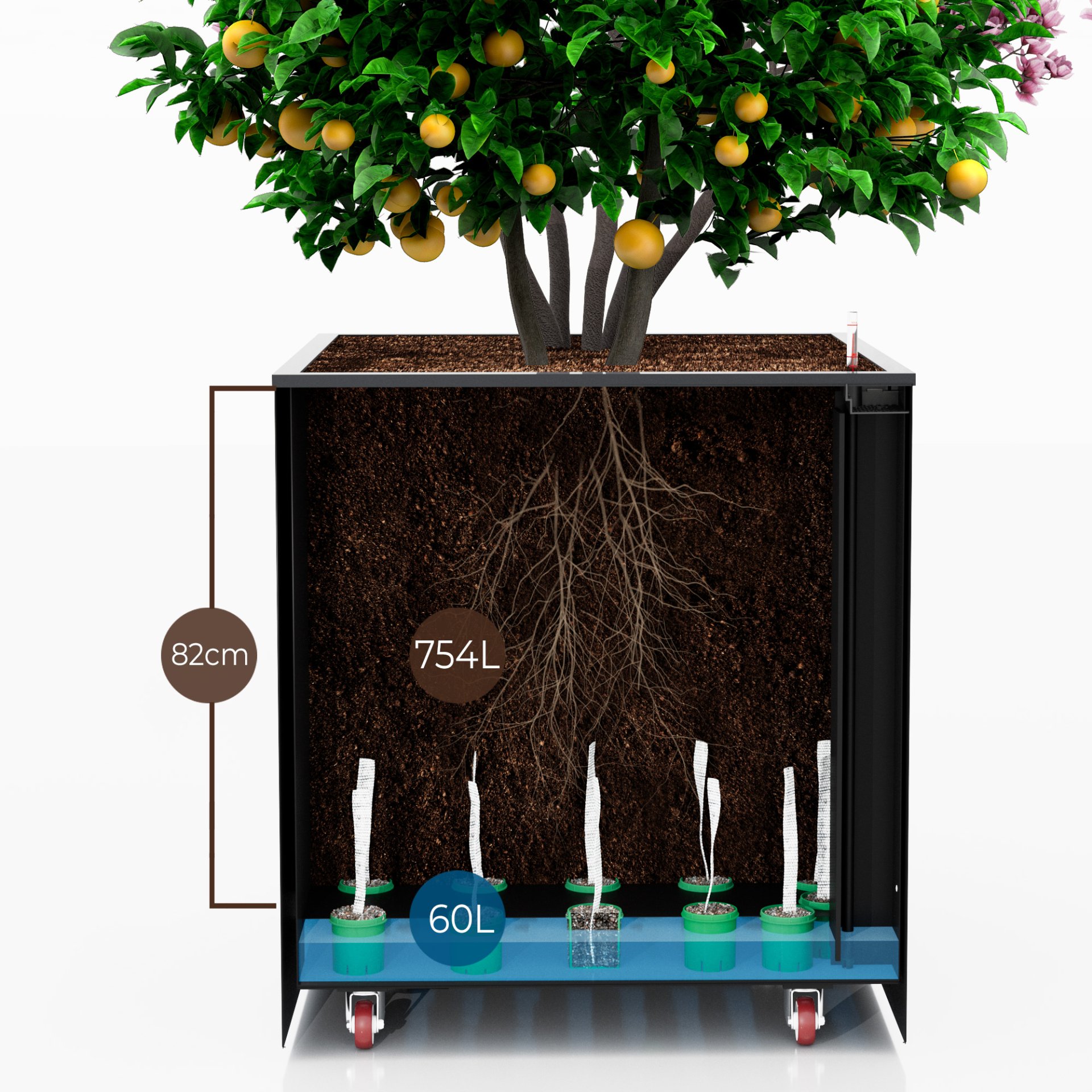 Květináč spojuje dvě základní funkce pro zdravý růst rostlin – velký objem a samozavlažovací funkci. Objem pro substrát lze upravit dle velikosti rostliny – dvě úrovně dna. Samozavlažovací funkce každého květináče je doplněna o důmyslný odtok přebytečné vody v exteriéru.