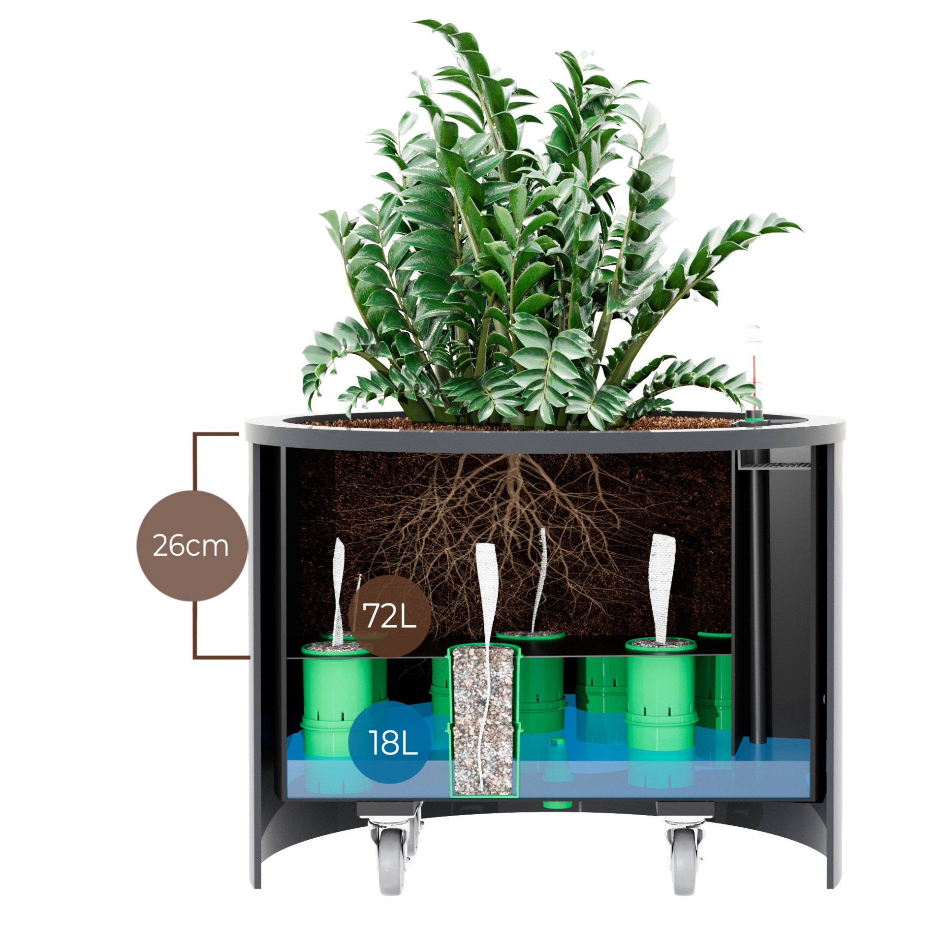 Květináč spojuje dvě základní funkce pro zdravý růst rostlin – velký objem a samozavlažovací funkci. Objem pro substrát lze upravit dle velikosti rostliny – dvě úrovně dna. Samozavlažovací funkce každého květináče je doplněna o důmyslný odtok přebytečné vody v exteriéru.