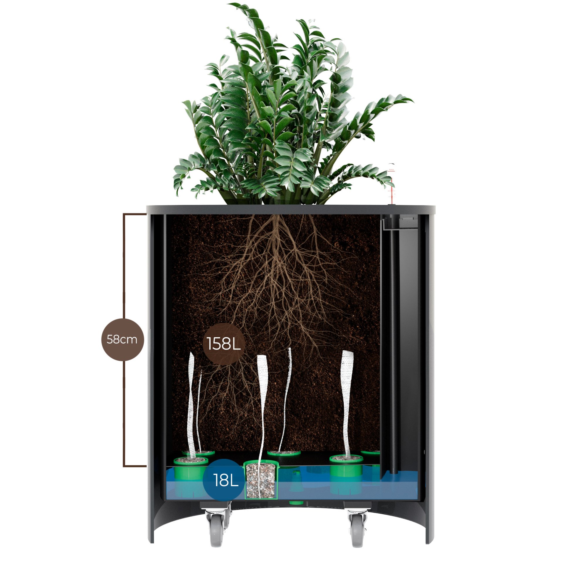 Květináč spojuje dvě základní funkce pro zdravý růst rostlin – velký objem a samozavlažovací funkci. Objem pro substrát lze upravit dle velikosti rostliny – dvě úrovně dna. Samozavlažovací funkce každého květináče je doplněna o důmyslný odtok přebytečné vody v exteriéru.