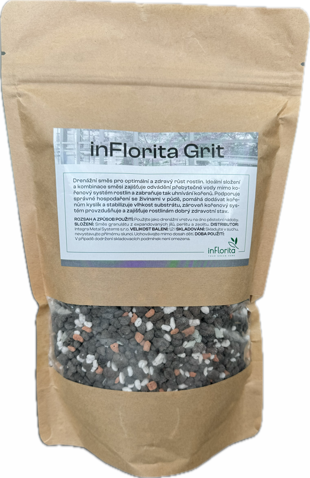 InFlorita grit se skládá ze čtyř druhů minerálů a každý přispívá k optimálnímu růstu a zdraví zasazené rostliny. Liapor má neutrální PH zabraňuje růstu nežádoucího plevele a zabraňuje vysychání zeminy. Perlit stabilizuje vlhkost půdy a zlepšuje vstřebávání živin. Zeolit účinně reguluje hospodaření se živinami v půdě, váže na sebe a postupně uvolňuje hnojivo a zlepšuje hospodaření s vodou. Napomáhá vytvořit ideální prostředí pro množení užitečných půdních bakterií. Seramis dokáže absorbovat velké množství vody a podle potřeby ji uvolňovat a zároveň dodává rostlinám kyslík.