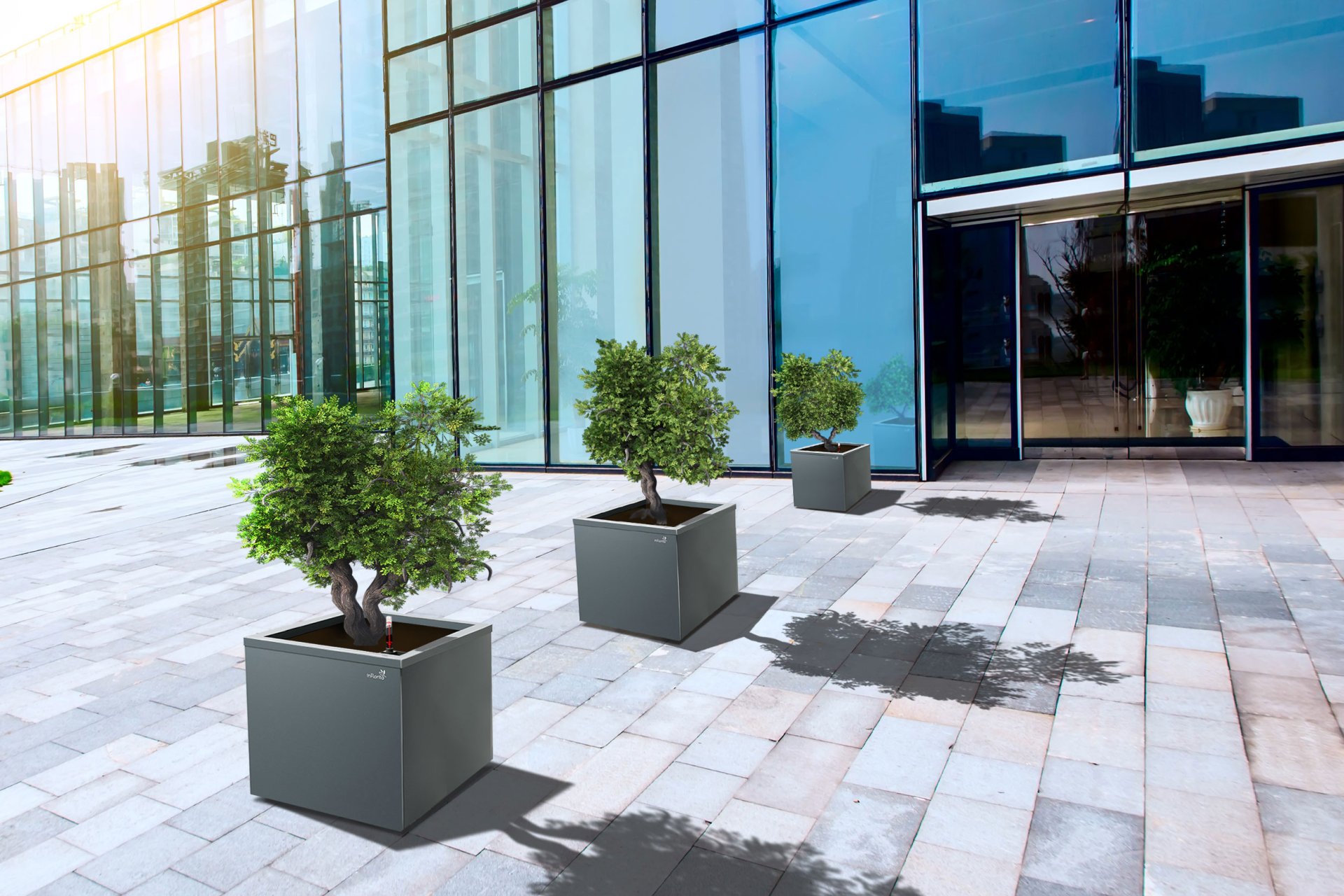 Velkoobjemový samozavlažovací květináč s bezúdržbovou povrchovou úpravou zajišťující stálobarevnost a odolnost vůči UV záření.