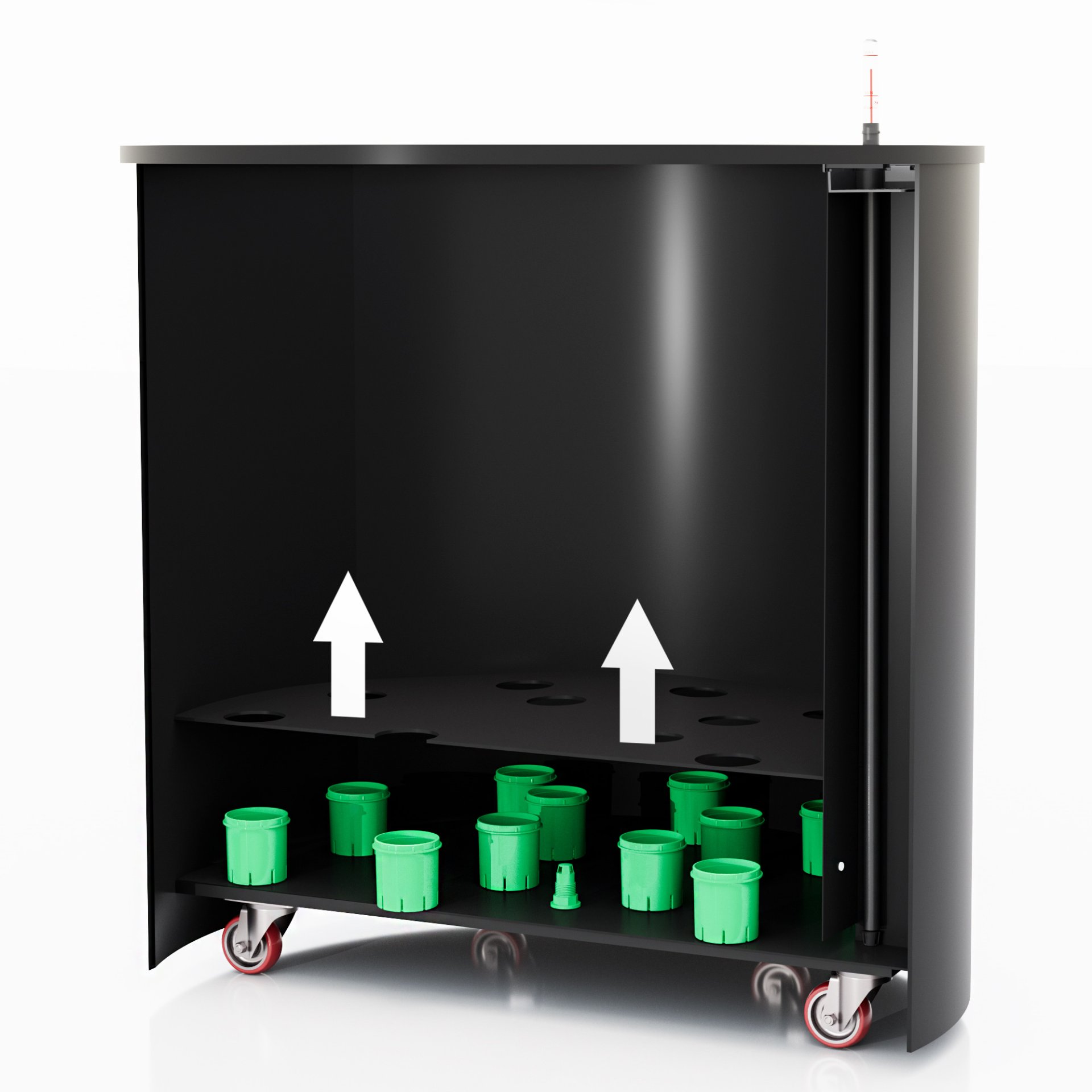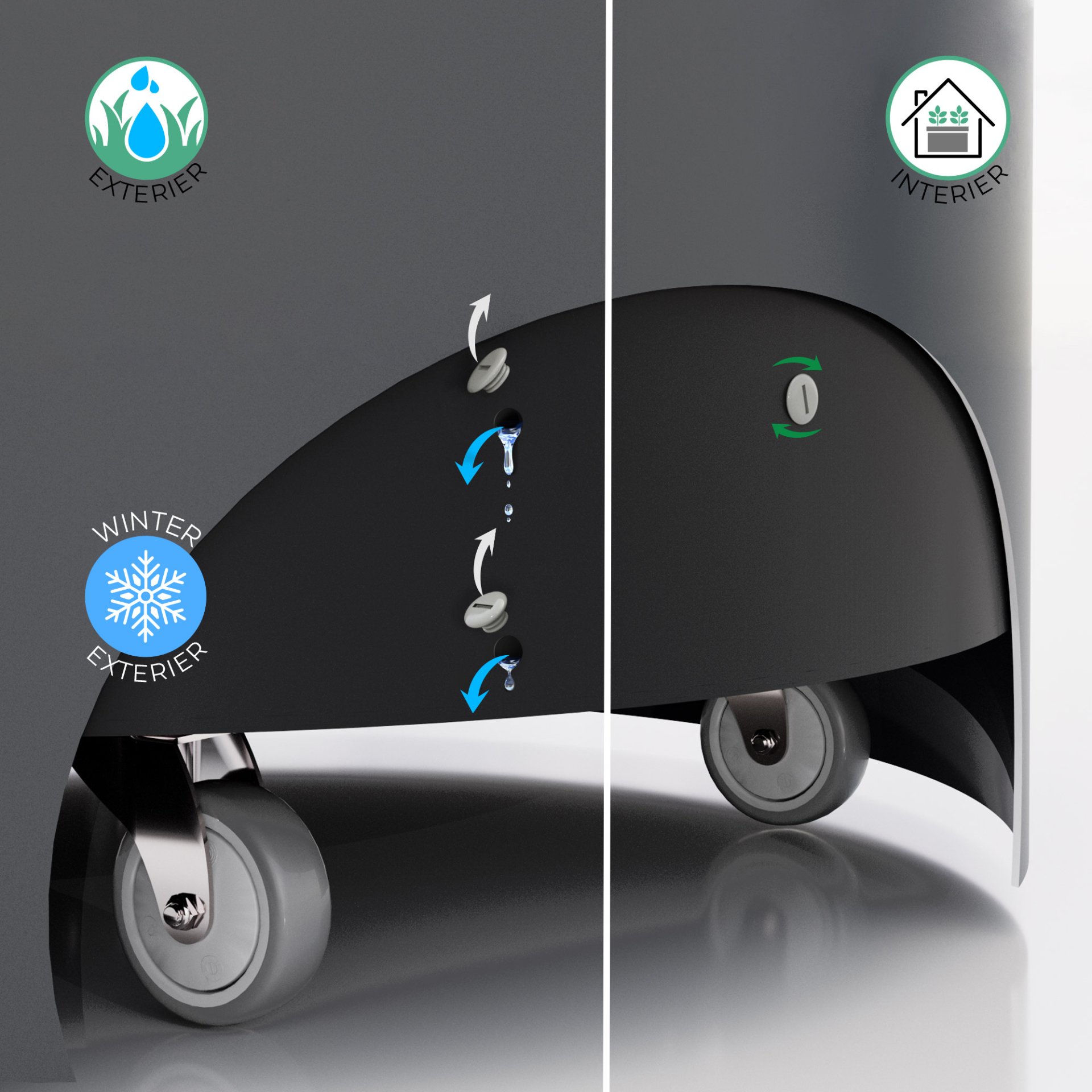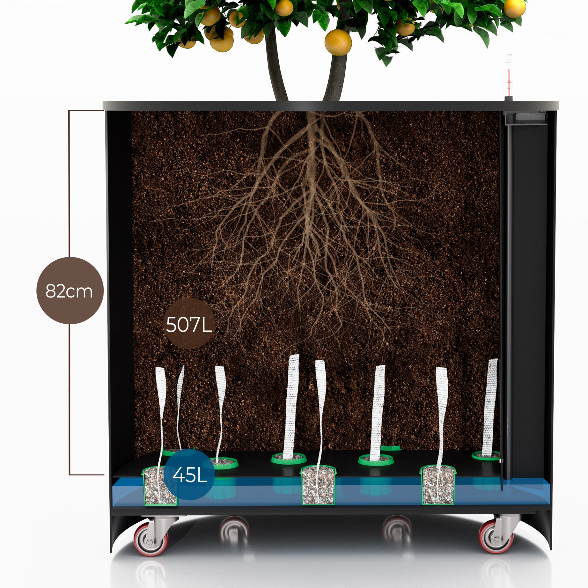 Květináč spojuje dvě základní funkce pro zdravý růst rostlin – velký objem a samozavlažovací funkci. Objem pro substrát lze upravit dle velikosti rostliny – dvě úrovně dna. Samozavlažovací funkce každého květináče je doplněna o důmyslný odtok přebytečné vody v exteriéru.