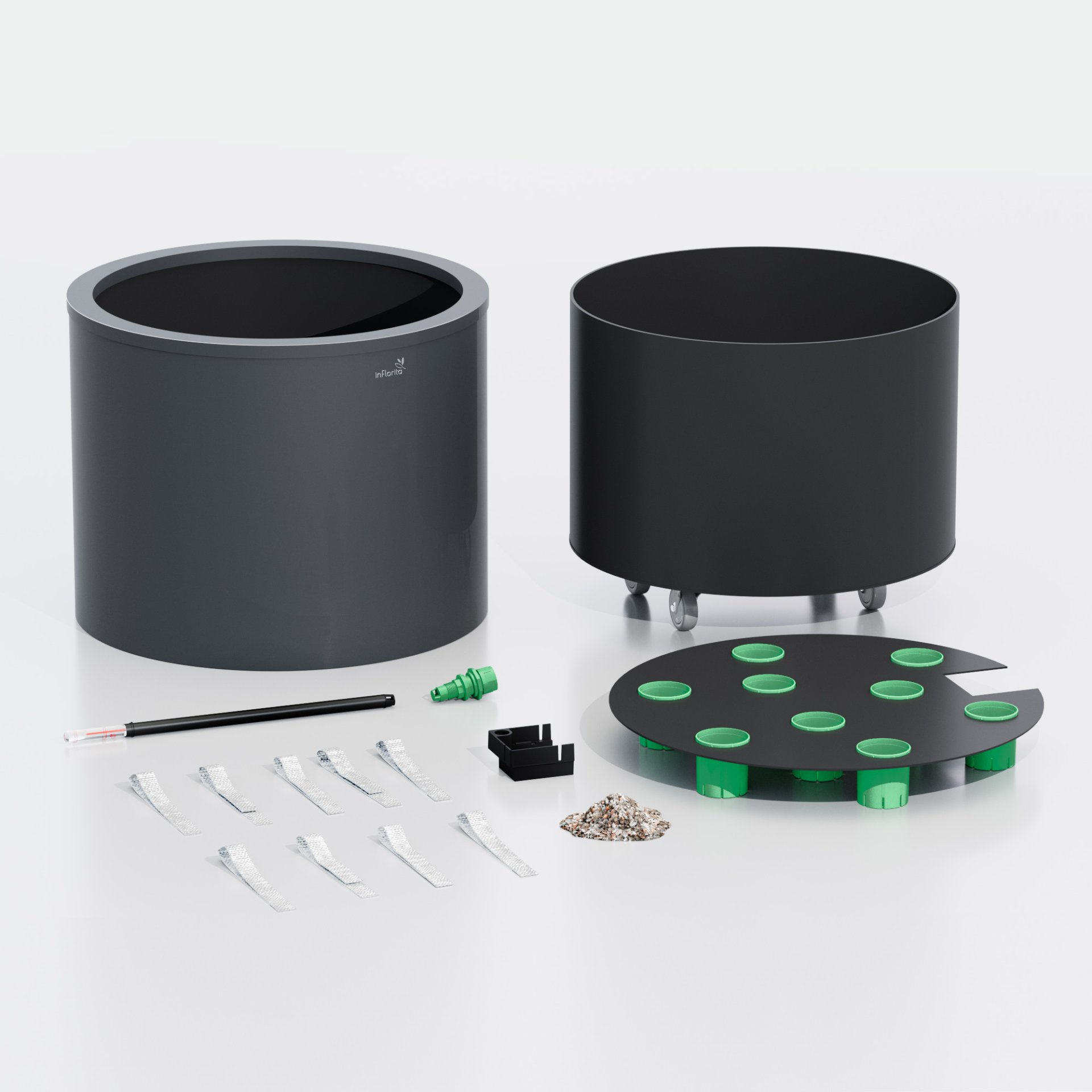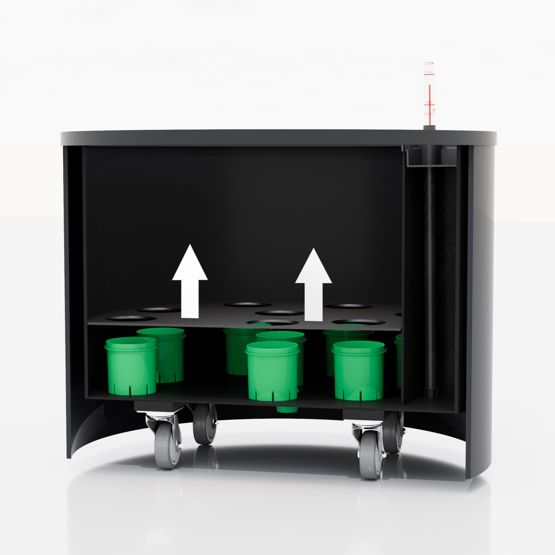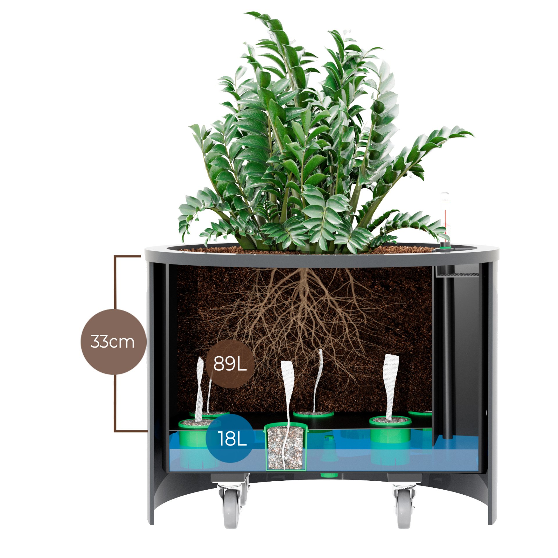 Květináč spojuje dvě základní funkce pro zdravý růst rostlin – velký objem a samozavlažovací funkci. Objem pro substrát lze upravit dle velikosti rostliny – dvě úrovně dna. Samozavlažovací funkce každého květináče je doplněna o důmyslný odtok přebytečné vody v exteriéru.