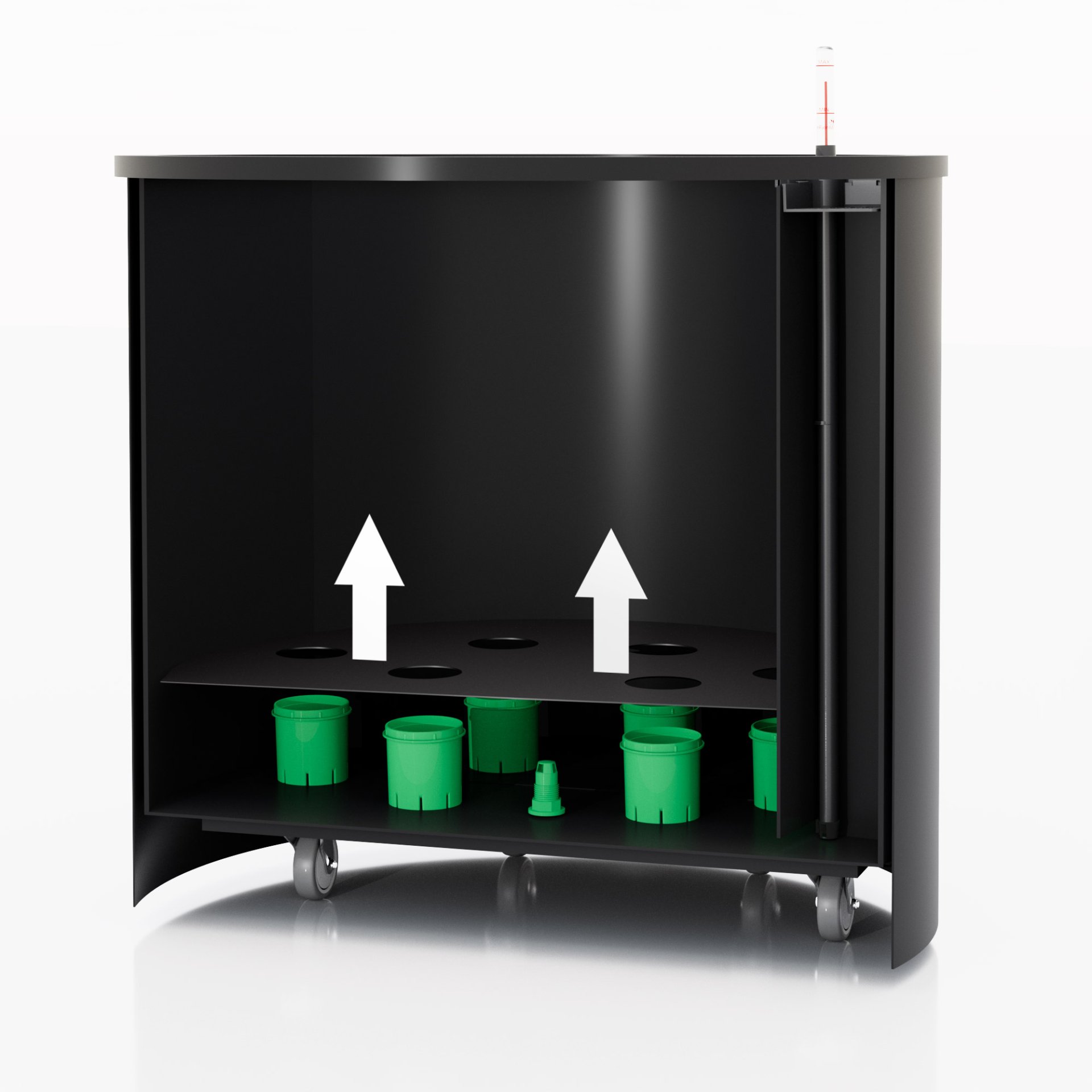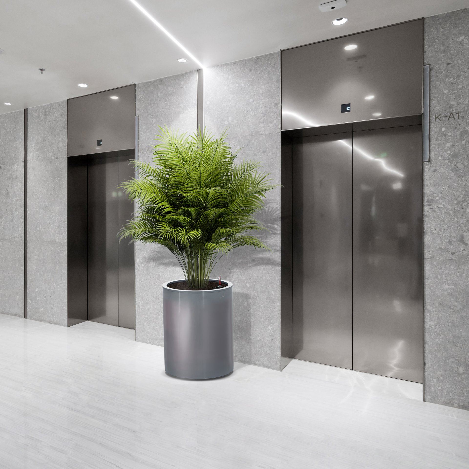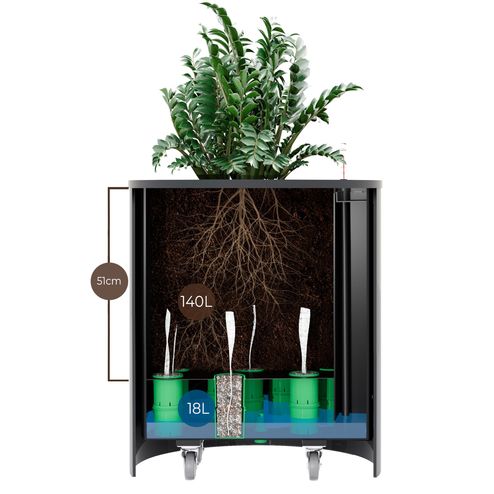 Květináč spojuje dvě základní funkce pro zdravý růst rostlin – velký objem a samozavlažovací funkci. Objem pro substrát lze upravit dle velikosti rostliny – dvě úrovně dna. Samozavlažovací funkce každého květináče je doplněna o důmyslný odtok přebytečné vody v exteriéru.