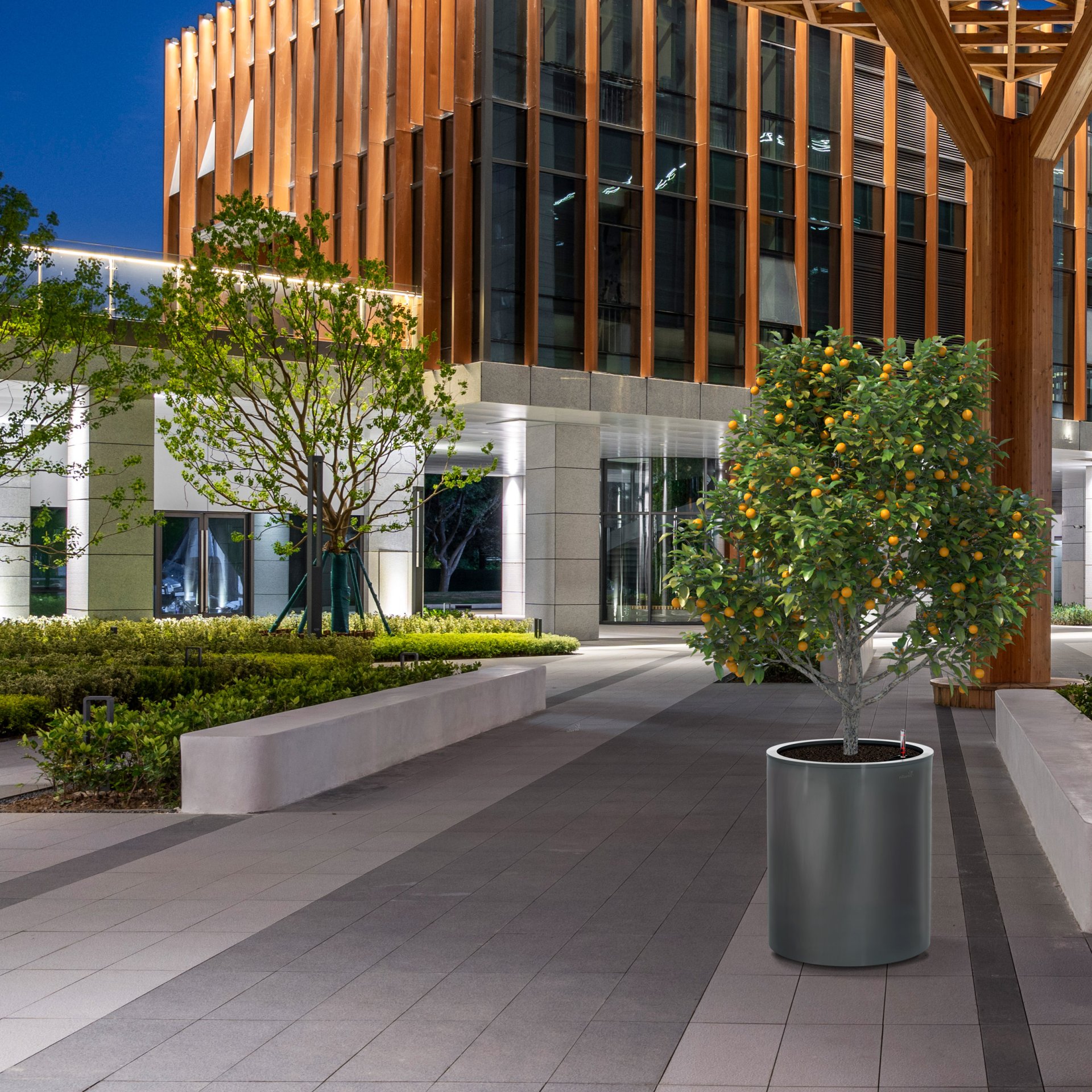 Velkoobjemový samozavlažovací květináč s bezúdržbovou povrchovou úpravou zajišťující stálobarevnost a odolnost vůči UV záření.