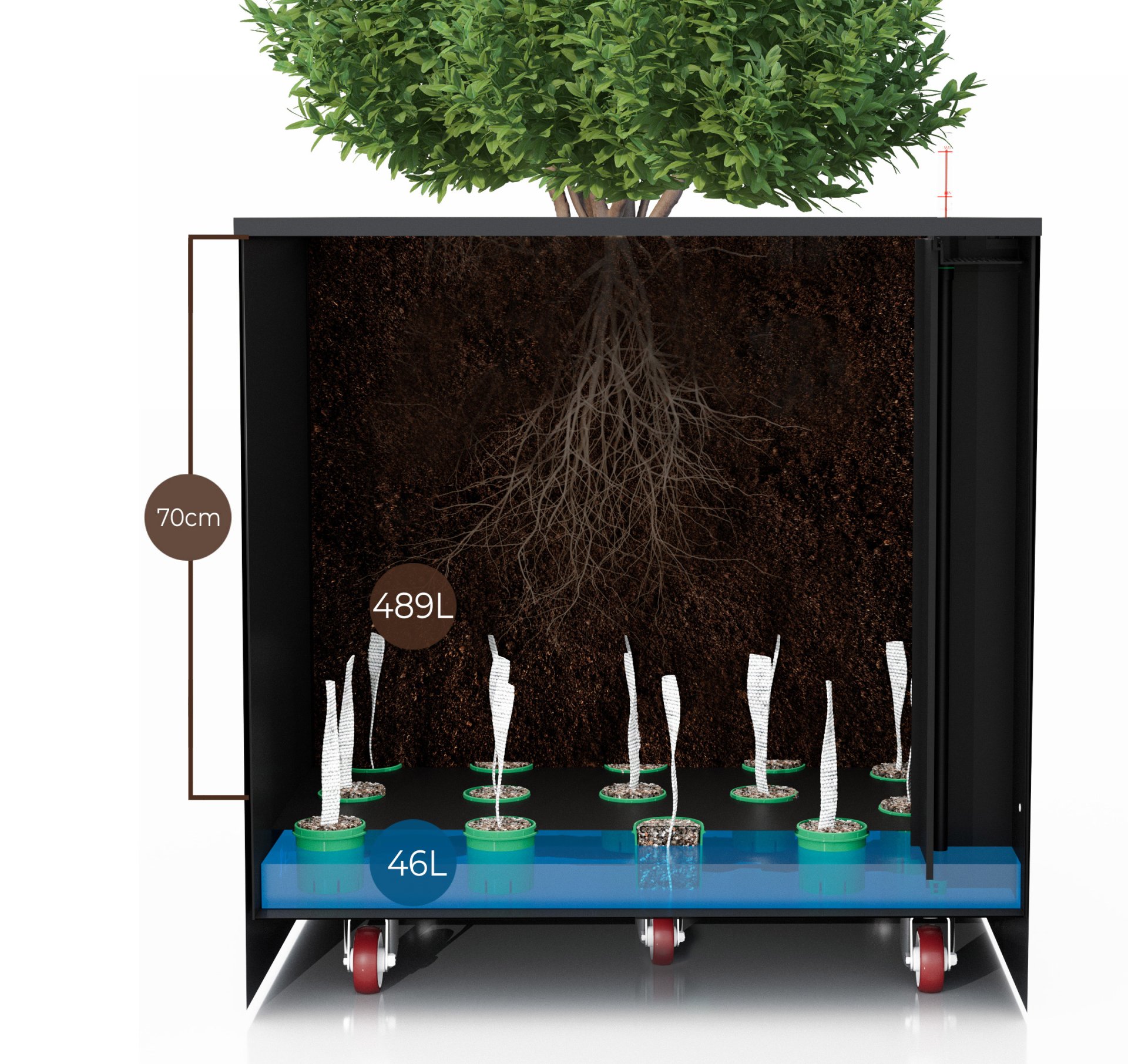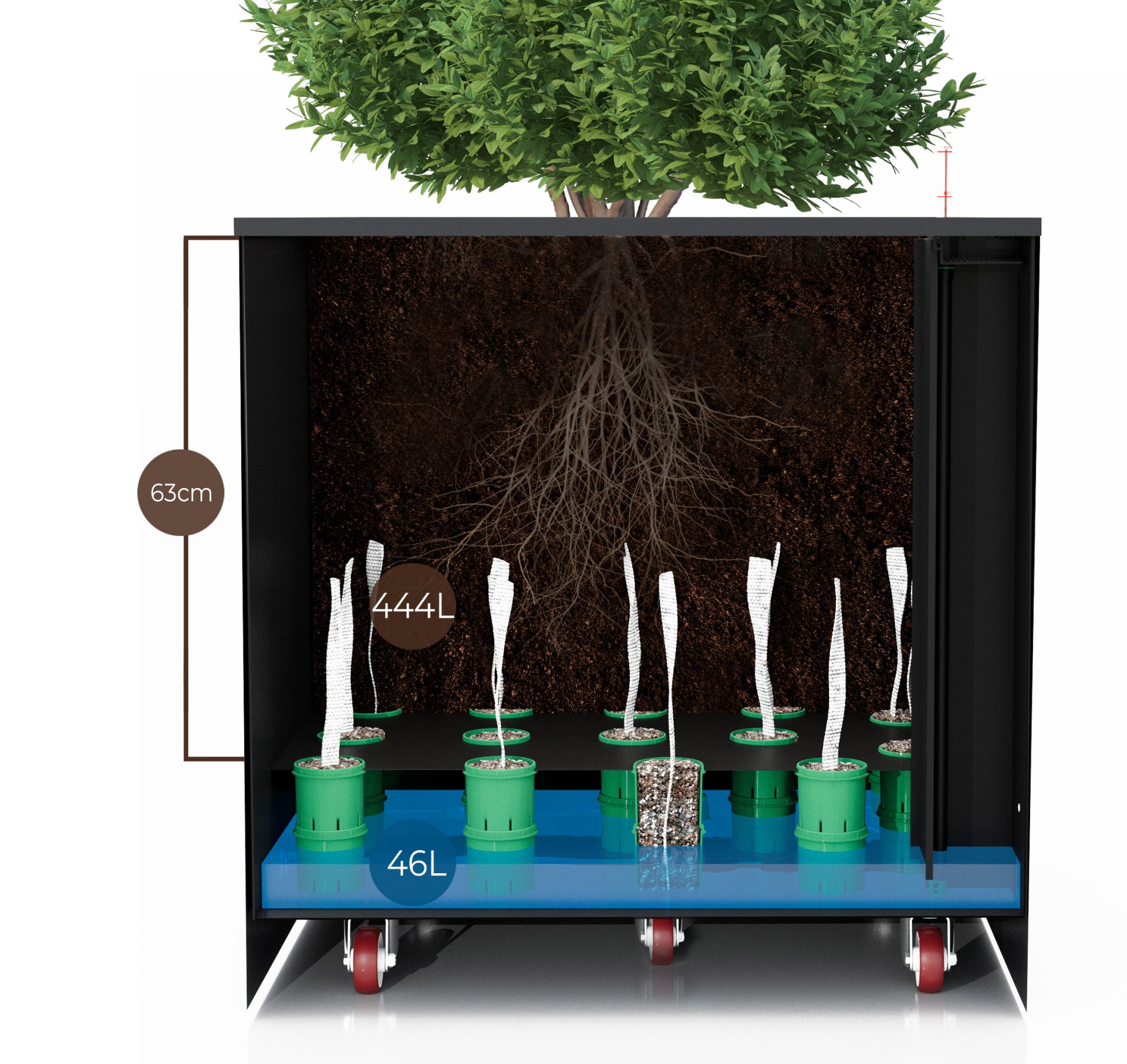 Květináč spojuje dvě základní funkce pro zdravý růst rostlin – velký objem a samozavlažovací funkci. Objem pro substrát lze upravit dle velikosti rostliny – dvě úrovně dna. Samozavlažovací funkce každého květináče je doplněna o důmyslný odtok přebytečné vody v exteriéru.