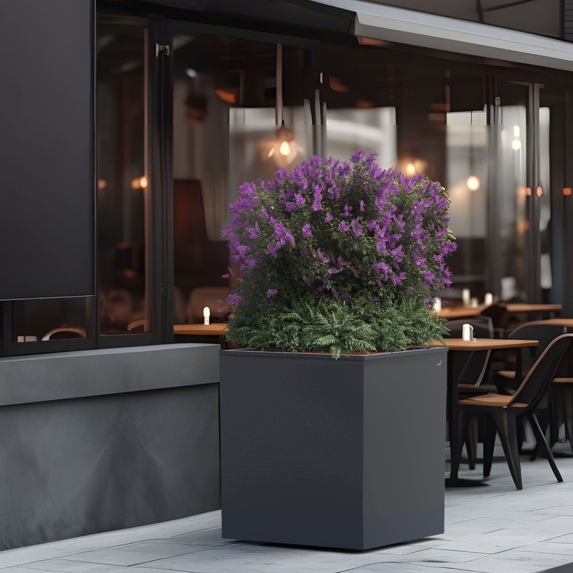 Velkoobjemový samozavlažovací květináč s bezúdržbovou povrchovou úpravou zajišťující stálobarevnost a odolnost vůči UV záření.